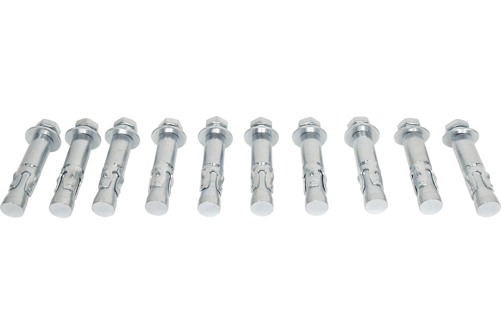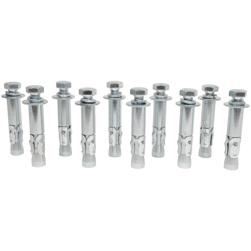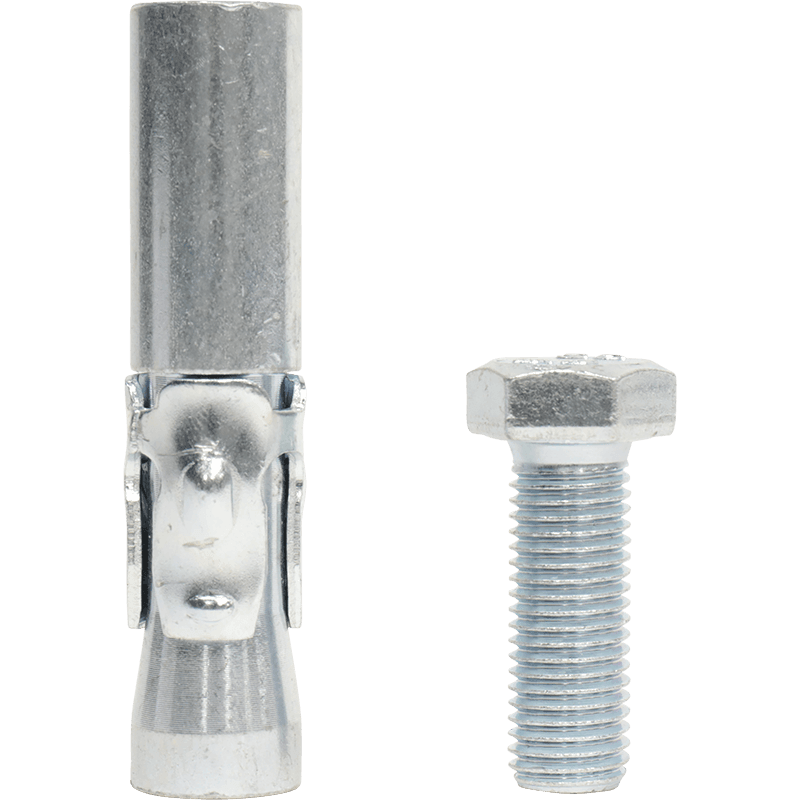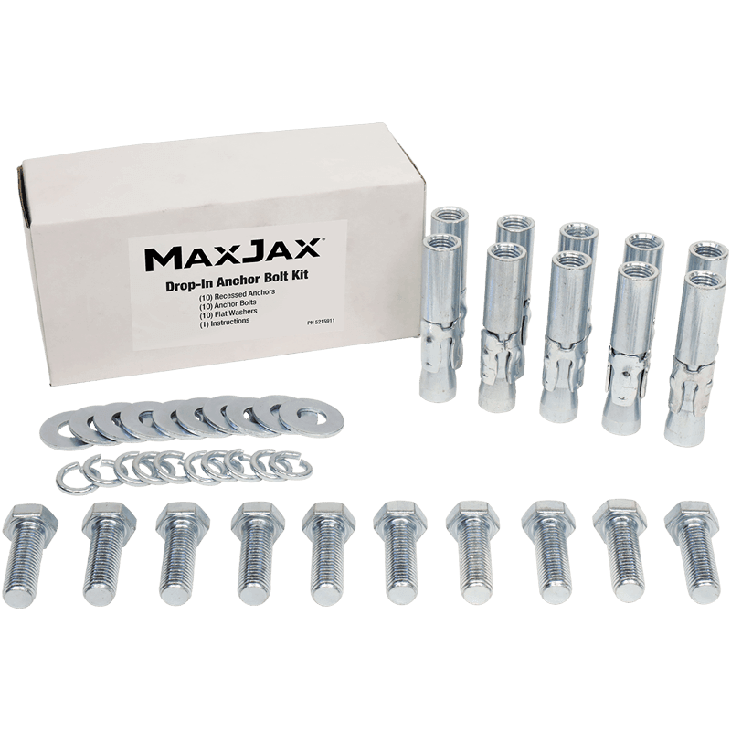 Les boulons d'ancrage MaxJax sont fabriqués en acier au carbone zingué avec un clip à coin, qui se dilatera pour ancrer solidement les poteaux MaxJax en place. Ces ancrages à insertion comprennent un mécanisme de type coin qui crée une fixation sûre, générant une résistance à la traction ultime pouvant atteindre 16 500 lb chacun lorsqu'ils sont installés dans du béton massif de 4 000 psi et/ou du béton non fissuré. Combinés, cela représente presque 12 fois la capacité maximale du système d'élévateur MaxJax de 7 000 lb par poteau !