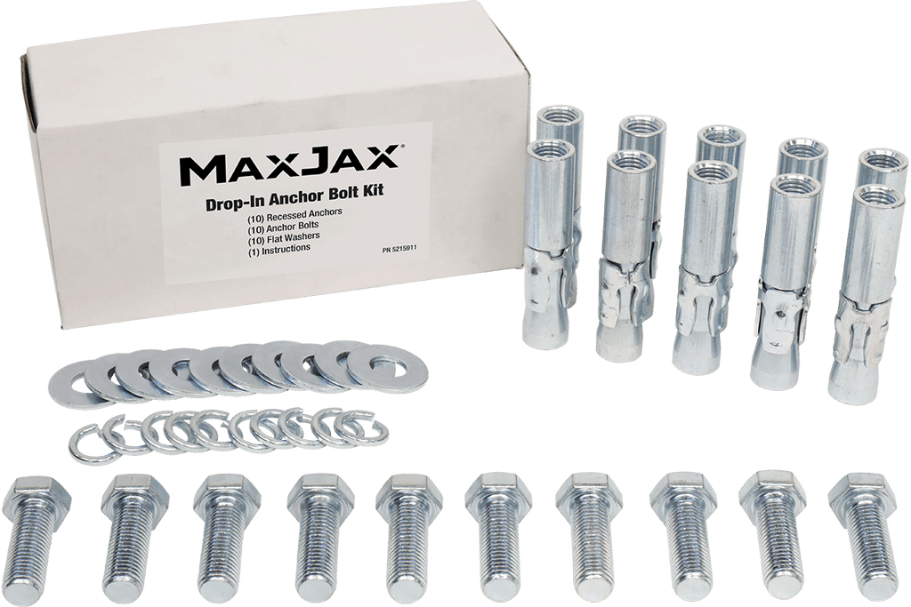 Profitez de la portabilité du MaxJax Two-Post Lift avec cet ensemble d'ancrages et de boulons supplémentaires. Le kit standard de boulons d'ancrage comprend 10 ancrages encastrés, 10 boulons d'ancrage et 10 rondelles plates, tout ce dont vous avez besoin pour ancrer votre élévateur automobile portable MaxJax Two-Post en toute sécurité. L'achat de jeux supplémentaires vous permettra d'installer votre MaxJax à plusieurs endroits dans votre atelier automobile ou votre garage à domicile. Par exemple, si vous souhaitez soulever votre véhicule pour retirer les roues dans la baie de lavage, puis déplacer le MaxJax à l'intérieur pour un nettoyage complet, un ensemble supplémentaire de boulons d'ancrage vous le permettra.