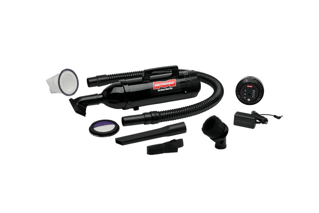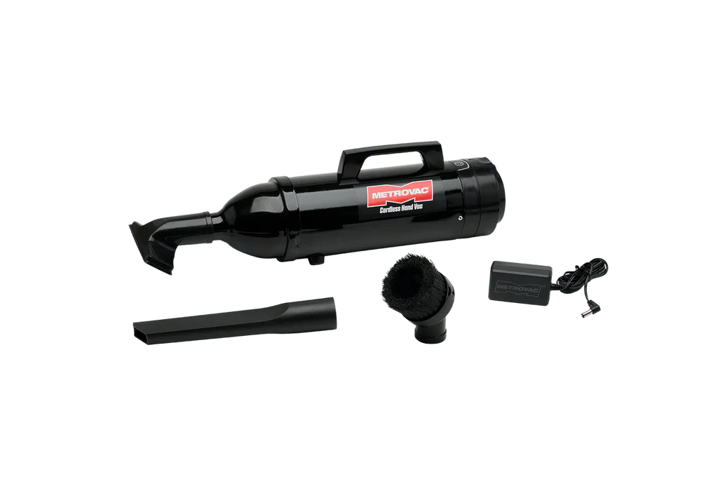 The MetroVac Cordless Hand Vac is compact and easy to use, weighing in at 3 lbs, 5 ounces. This cordless handheld vacuum features HEPA filtration with a convenient shake out disposable bag and a complete set of attachments for home, auto or shop use.