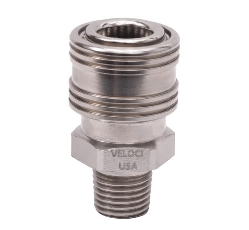Les raccords en acier inoxydable offrent des propriétés anticorrosion et des performances fiables. On les trouve généralement à tous les joints où un fluide à haute pression peut devoir être déconnecté après utilisation. D'autres zones telles que les lances, les embouts et les canons à mousse sont des endroits pratiques pour installer ces raccords rapides (QC). En règle générale, les coupleurs 1/4" de Veloci se trouvent normalement à l'extrémité du système de lavage sous pression, sur une lance de pulvérisation ou à la sortie du pistolet. Lors de l'achat de bouchons et de coupleurs, le raccord mâle a des filetages exposés tandis que le raccord femelle a des filetages à l'intérieur du raccord. Tous les raccords MTM sont à filetage NPT (National Pipe Thread), ce qui signifie qu'ils ont un filetage mâle ou femelle conique (selon le modèle). Le NPT est principalement utilisé en Amérique du Nord et a été développé sur le concept d'interférence du troisième filetage.