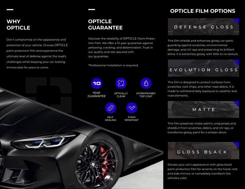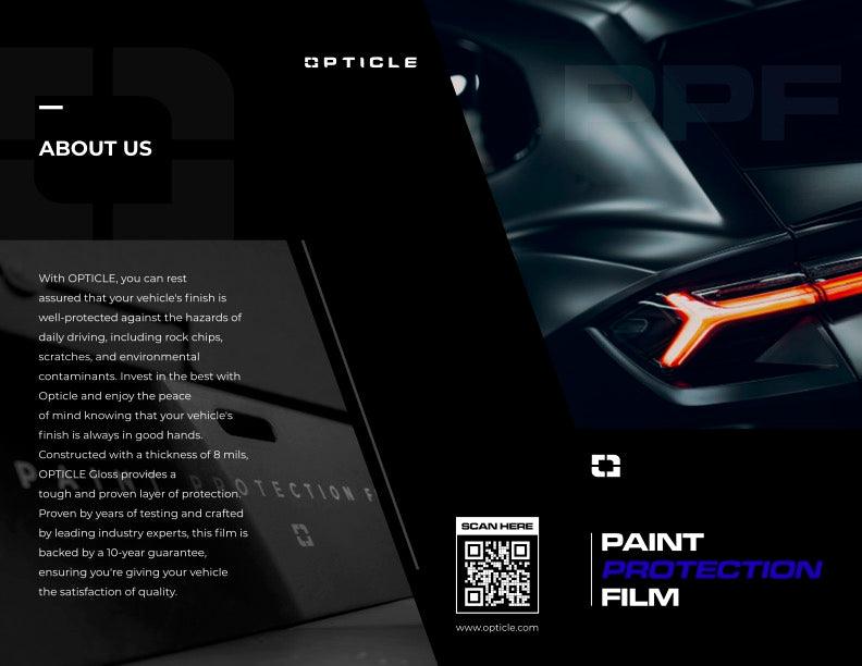 Vous devez convaincre votre client de tous les avantages et fonctionnalités incroyables d'Opticle ? Nous avons exactement ce qu'il vous faut : une brochure joliment imprimée au format 8,5" x 11". Parfaite pour présenter tous les avantages et fonctionnalités incroyables des films Opticle ! Avec un design magnifiquement imprimé dans un format pratique de 8,5" x 11", vous pourrez mettre en valeur tout ce que votre client doit savoir sur Opticle. Cette brochure est un incontournable pour toute présentation commerciale, offrant une représentation visuelle et informative de la valeur que notre produit apporte. Votre client sera impressionné et convaincu des immenses avantages qu'Opticle offre, en faisant un ajout essentiel à toute campagne marketing.